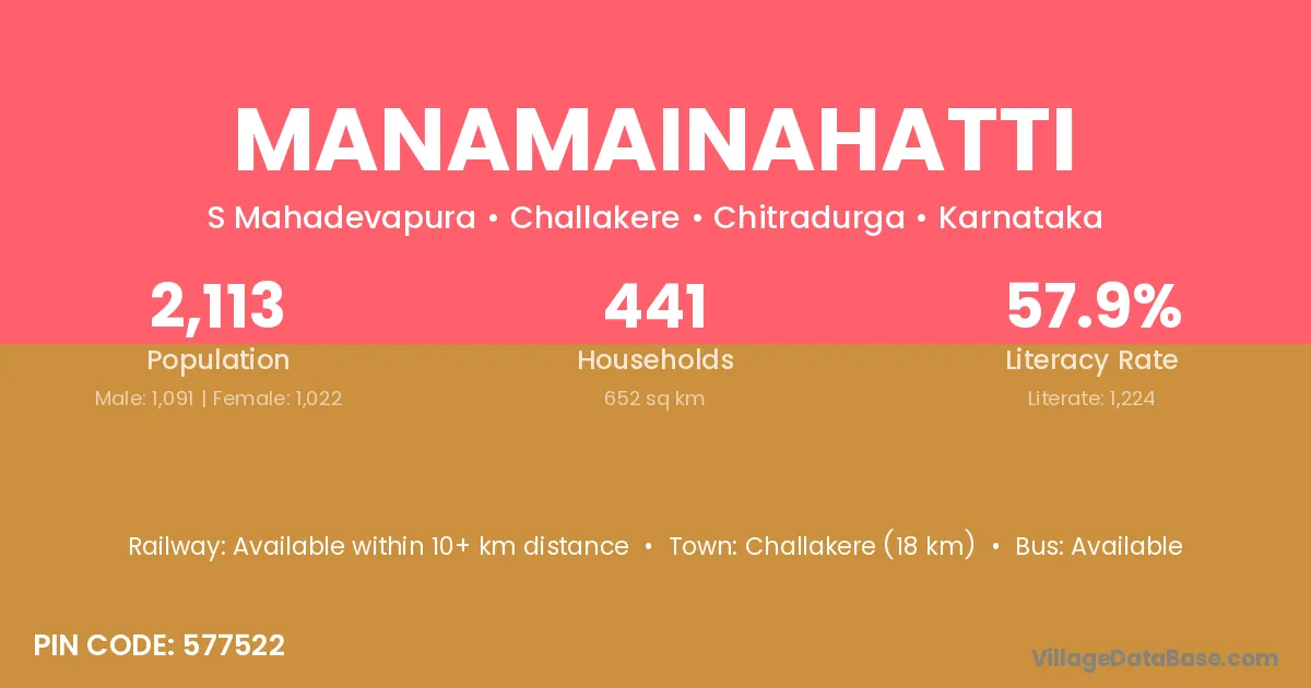 Manamainahatti village has a total population of 2,113 people, of which 1,091 are males and 1,022 are females.