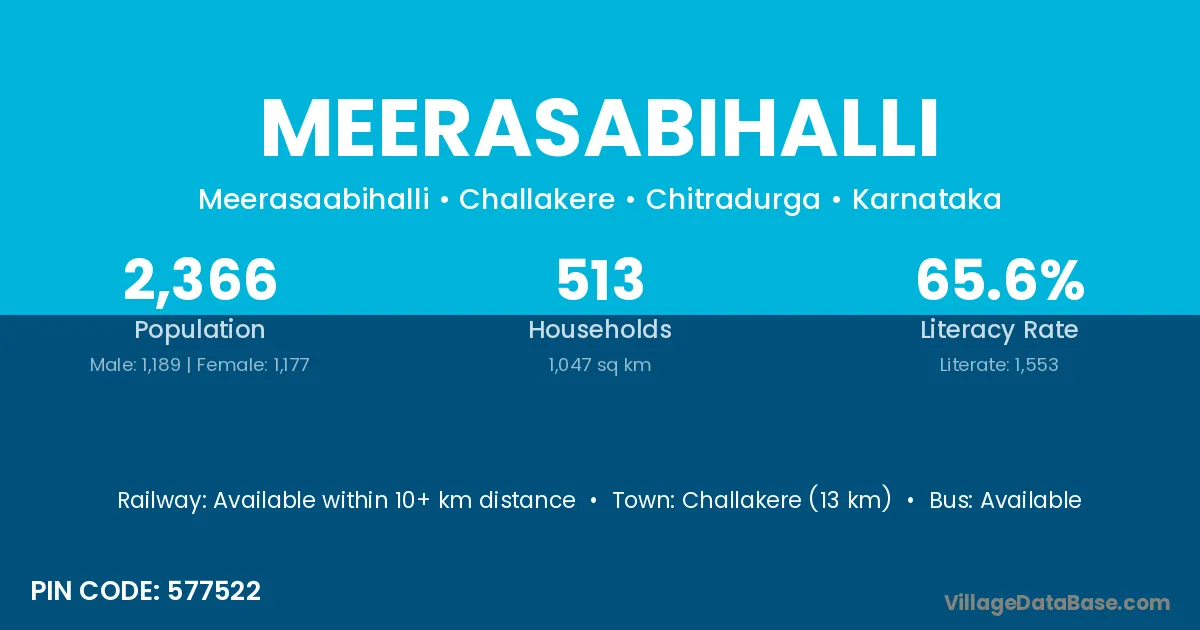 Challakere (13 km) is the nearest town to Meerasabihalli village for major economic activities and is located approximately 13 km away.