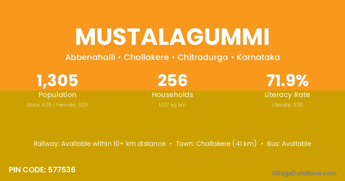 Challakere (41 km) is the nearest town to Mustalagummi village for major economic activities and is located approximately 41 km away.