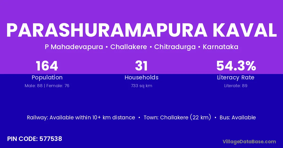 Challakere (22 km) is the nearest town to Parashuramapura Kaval village for major economic activities and is located approximately 22 km away.
