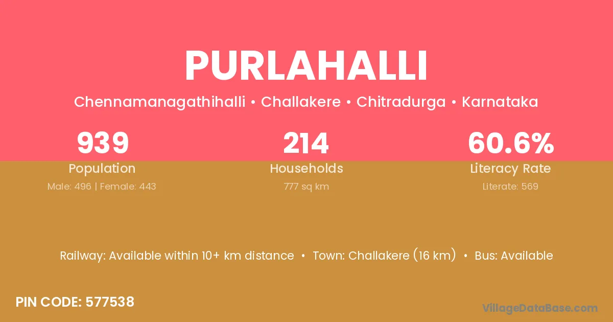 Challakere (16 km) is the nearest town to Purlahalli village for major economic activities and is located approximately 16 km away.