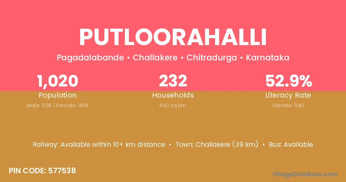 Putloorahalli village has a total population of 1,020 people, of which 536 are males and 484 are females.