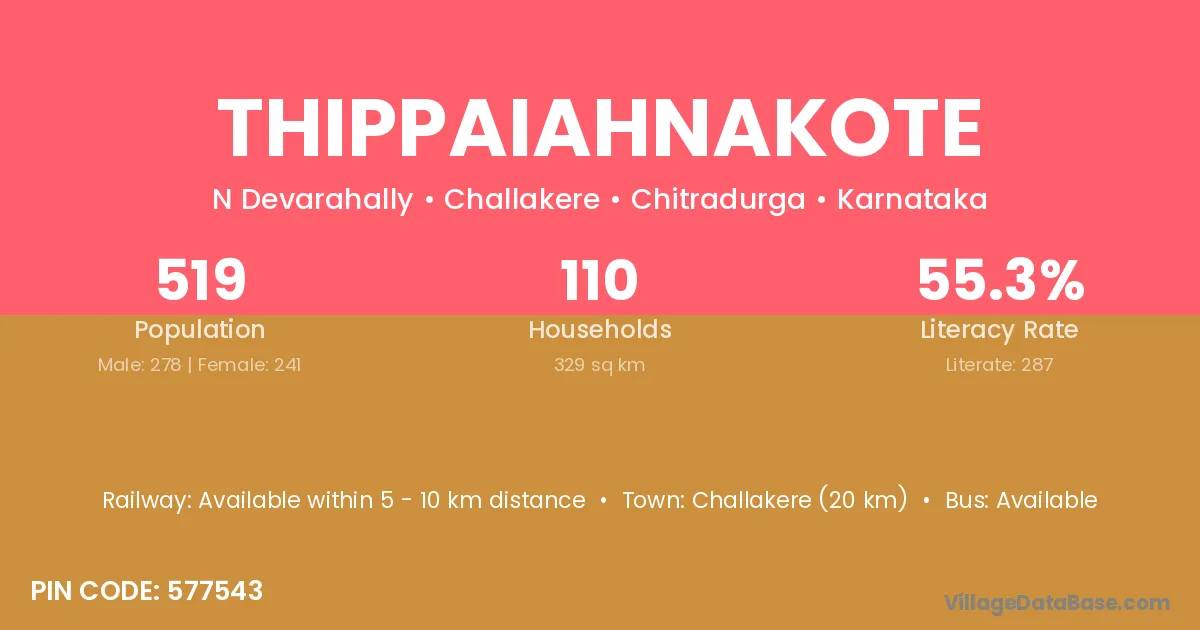 Thippaiahnakote village has a total population of 519 people, of which 278 are males and 241 are females.