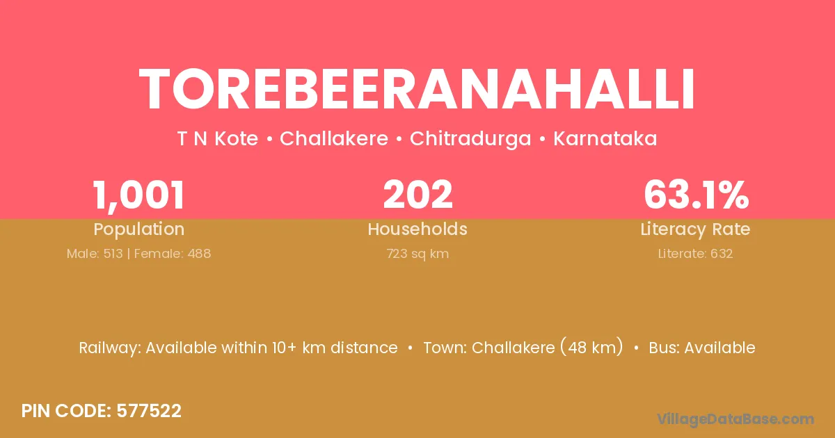 Challakere (48 km) is the nearest town to Torebeeranahalli village for major economic activities and is located approximately 48 km away.