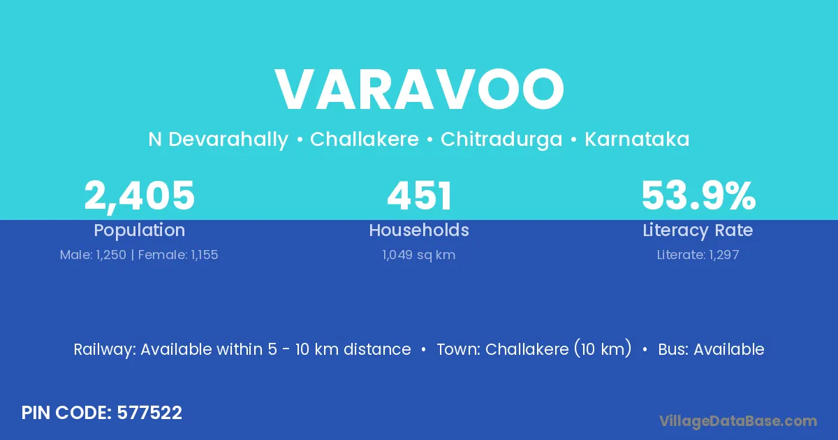 Challakere (10 km) is the nearest town to Varavoo village for major economic activities and is located approximately 10 km away.