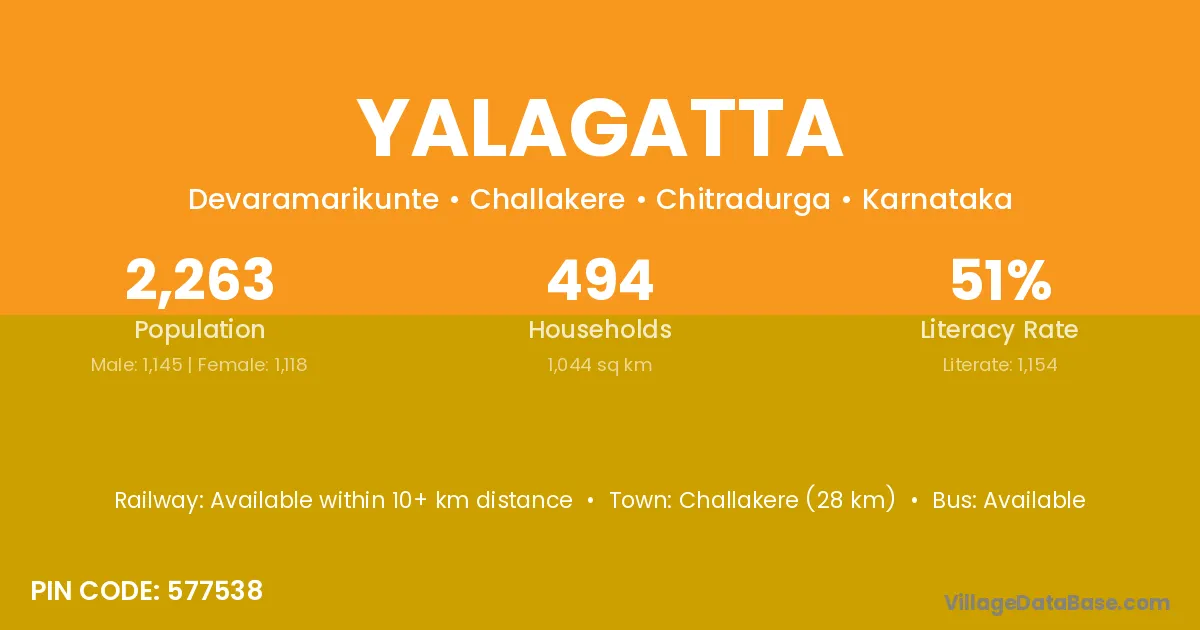 Challakere (28 km) is the nearest town to Yalagatta village for major economic activities and is located approximately 28 km away.