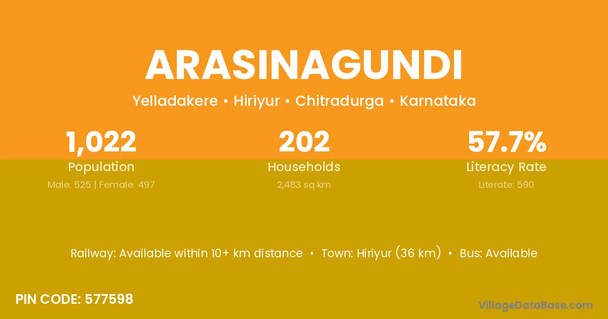 Hiriyur (36 km) is the nearest town to Arasinagundi village for major economic activities and is located approximately 36 km away.