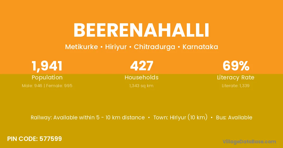 Hiriyur (10 km) is the nearest town to Beerenahalli village for major economic activities and is located approximately 10 km away.