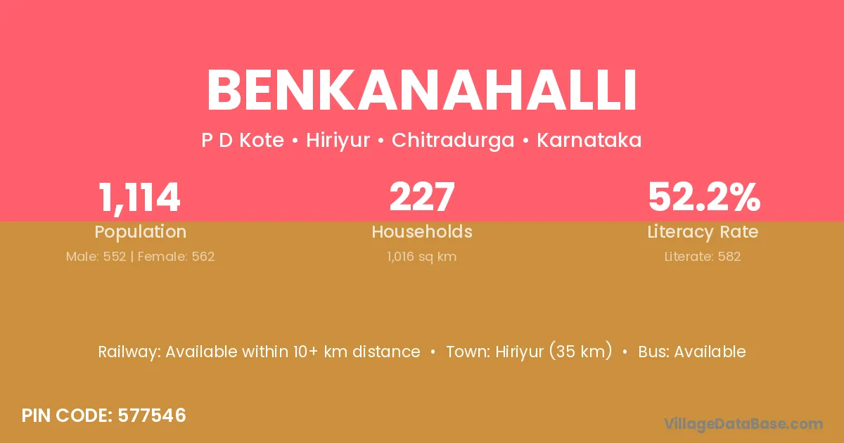 Benkanahalli village has a total population of 1,114 people, of which 552 are males and 562 are females.