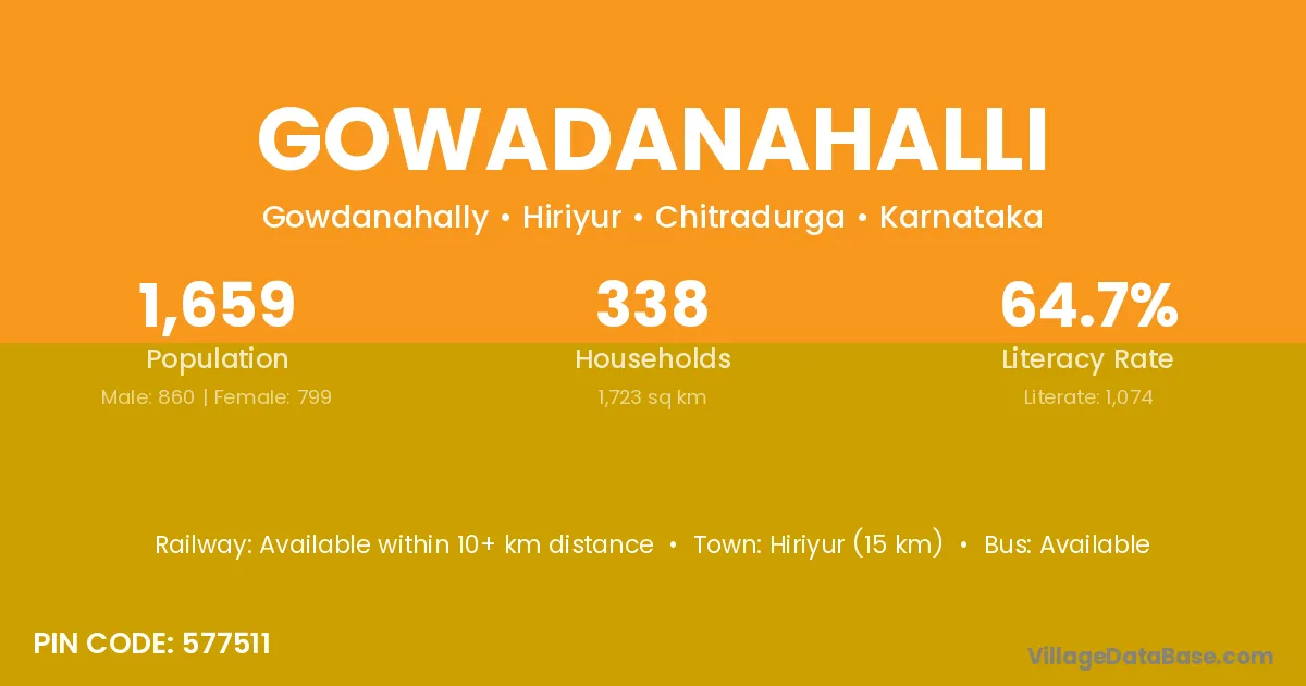 Hiriyur (15 km) is the nearest town to Gowadanahalli village for major economic activities and is located approximately 15 km away.