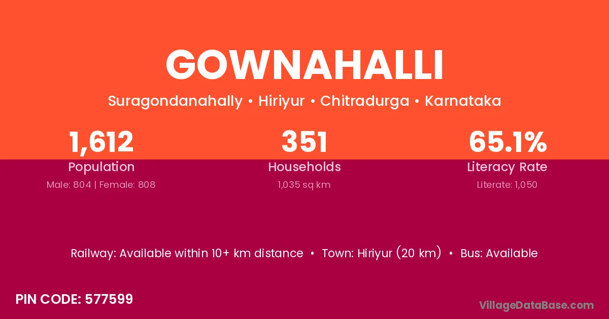 Hiriyur (20 km) is the nearest town to Gownahalli village for major economic activities and is located approximately 20 km away.