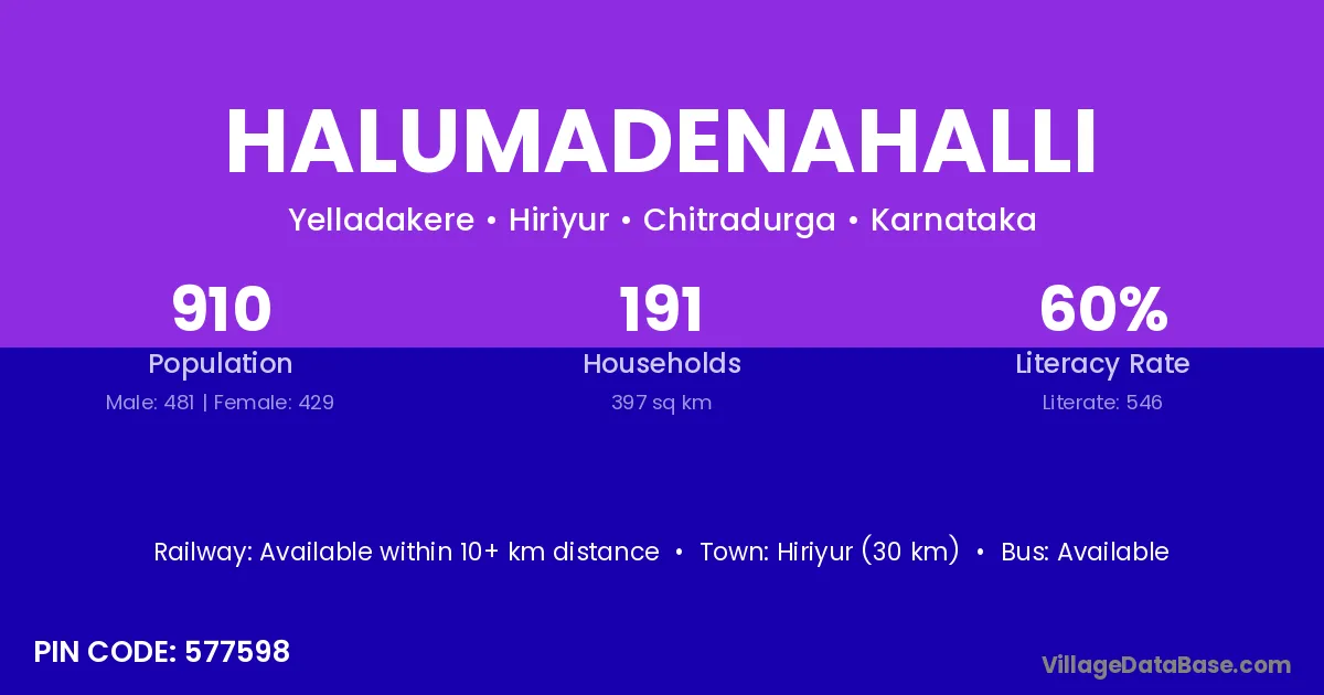 Halumadenahalli village has a total population of 910 people, of which 481 are males and 429 are females.