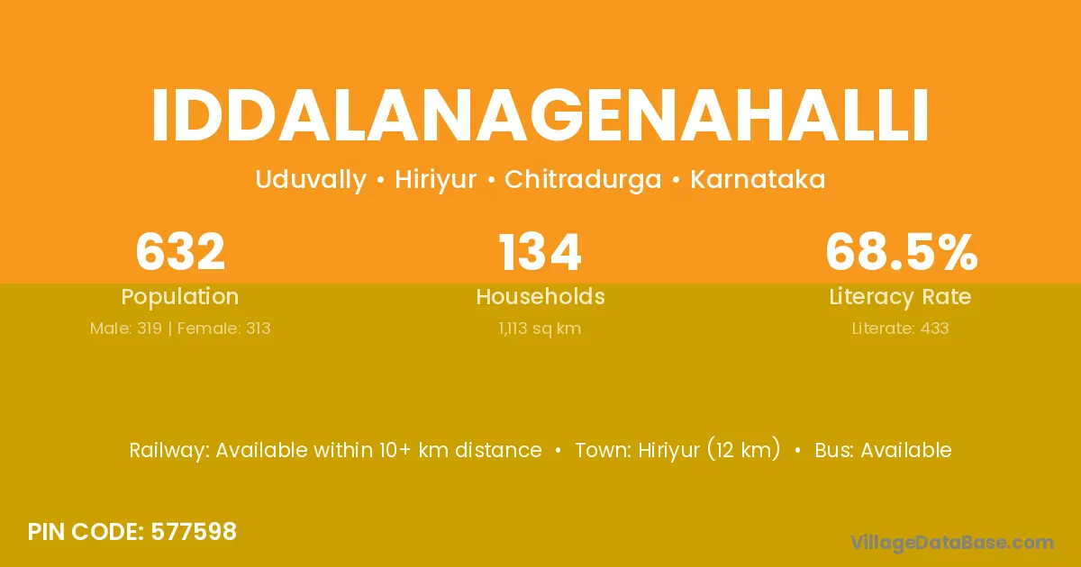 Hiriyur (12 km) is the nearest town to Iddalanagenahalli village for major economic activities and is located approximately 12 km away.