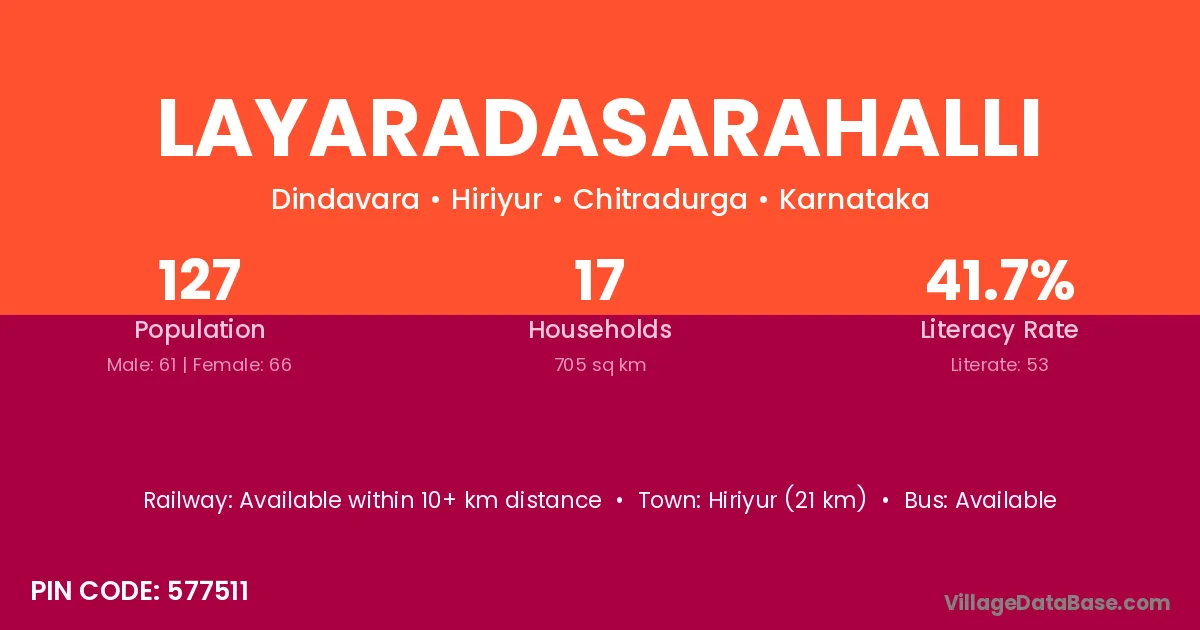 Hiriyur (21 km) is the nearest town to Layaradasarahalli village for major economic activities and is located approximately 21 km away.