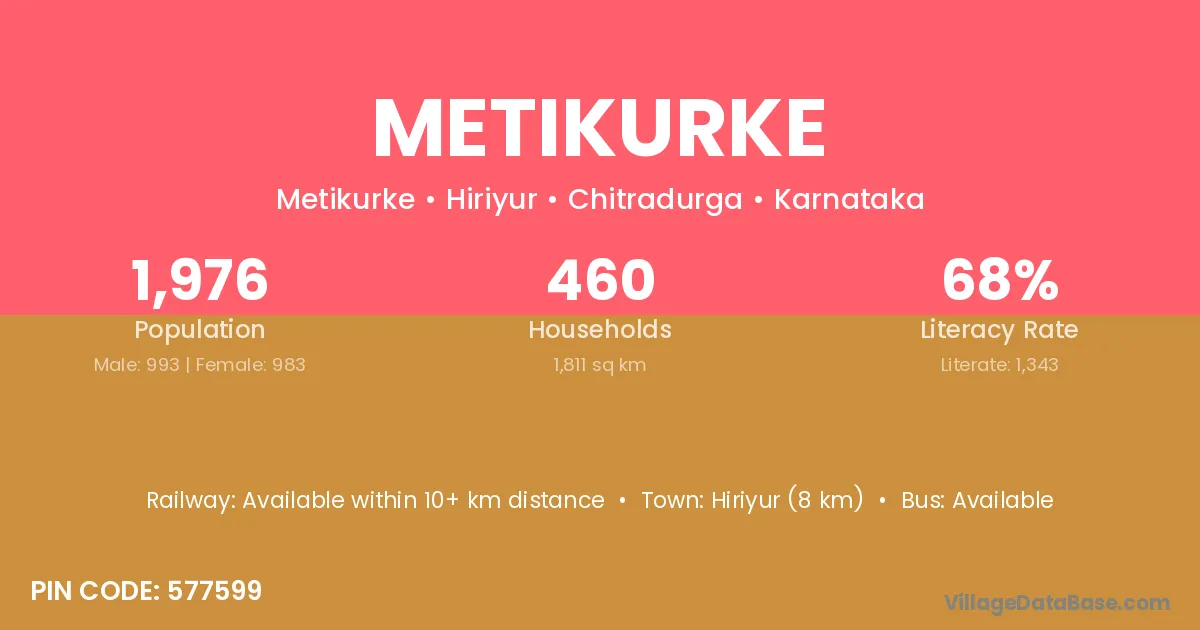 Metikurke village has a total population of 1,976 people, of which 993 are males and 983 are females.