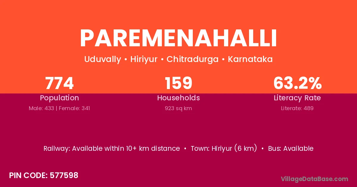 Hiriyur (6 km) is the nearest town to Paremenahalli village for major economic activities and is located approximately 6 km away.