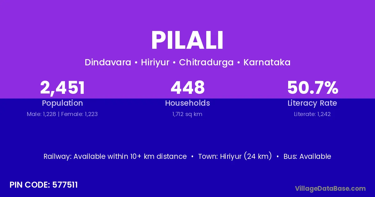 Hiriyur (24 km) is the nearest town to Pilali village for major economic activities and is located approximately 24 km away.