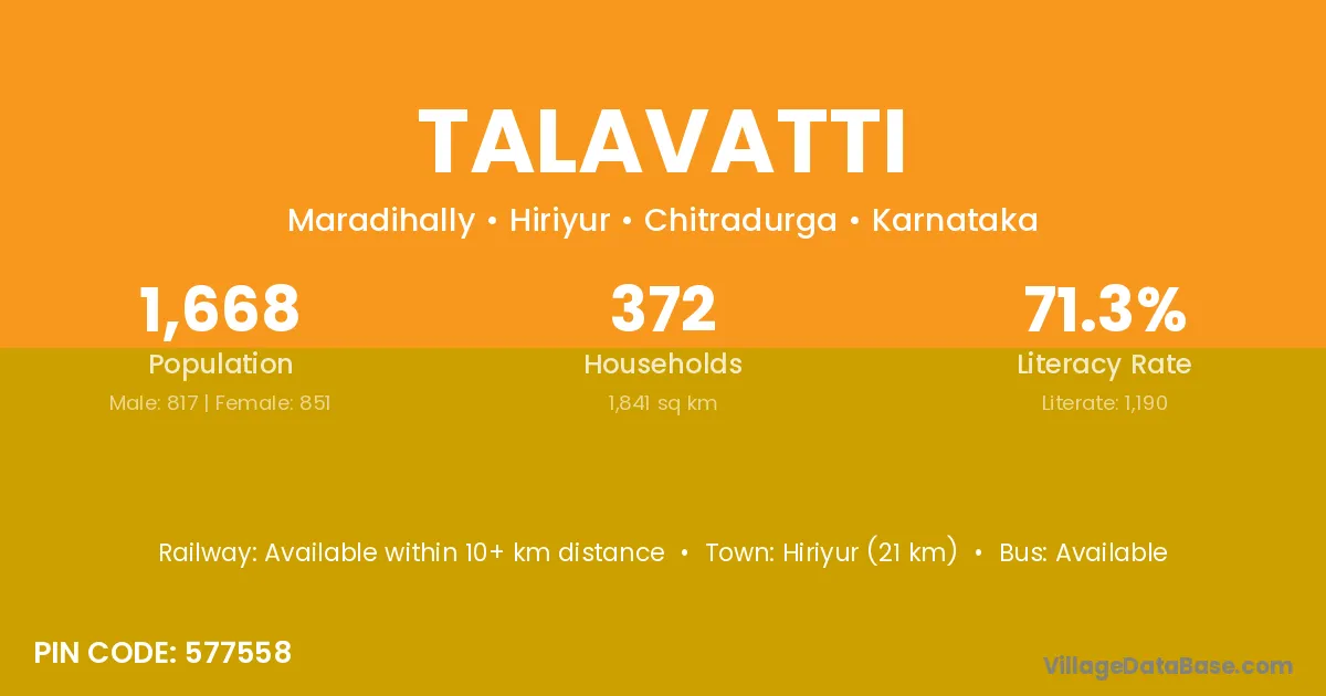 Hiriyur (21 km) is the nearest town to Talavatti village for major economic activities and is located approximately 21 km away.