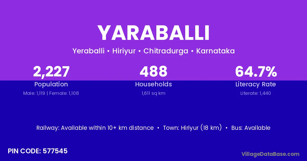 Hiriyur (18 km) is the nearest town to Yaraballi village for major economic activities and is located approximately 18 km away.
