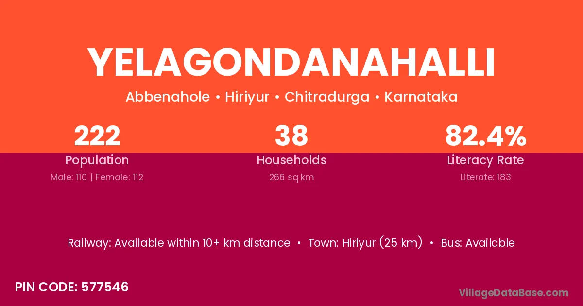 Yelagondanahalli village has a total population of 222 people, of which 110 are males and 112 are females.