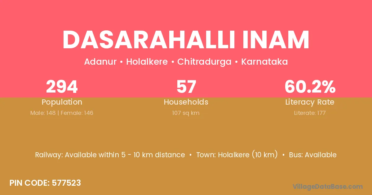 Dasarahalli Inam village has a total population of 294 people, of which 148 are males and 146 are females.