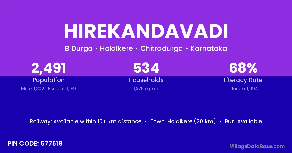 Holalkere (20 km) is the nearest town to Hirekandavadi village for major economic activities and is located approximately 20 km away.