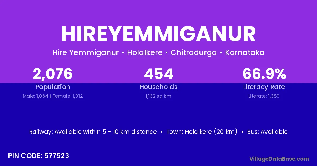Holalkere (20 km) is the nearest town to Hireyemmiganur village for major economic activities and is located approximately 20 km away.