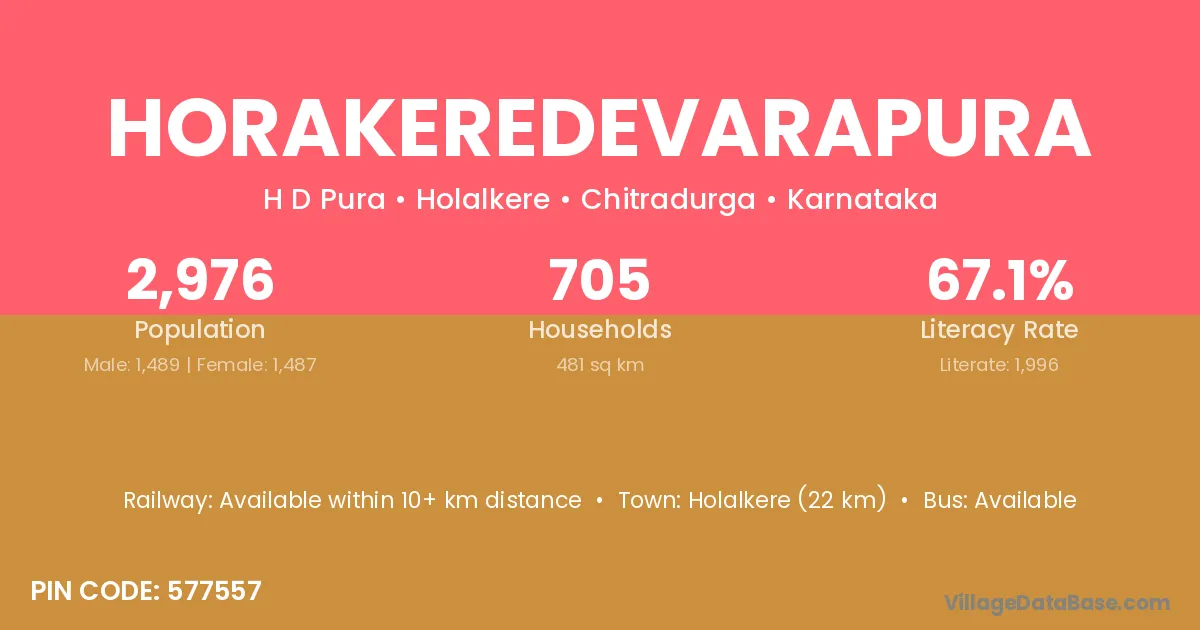 Holalkere (22 km) is the nearest town to Horakeredevarapura village for major economic activities and is located approximately 22 km away.