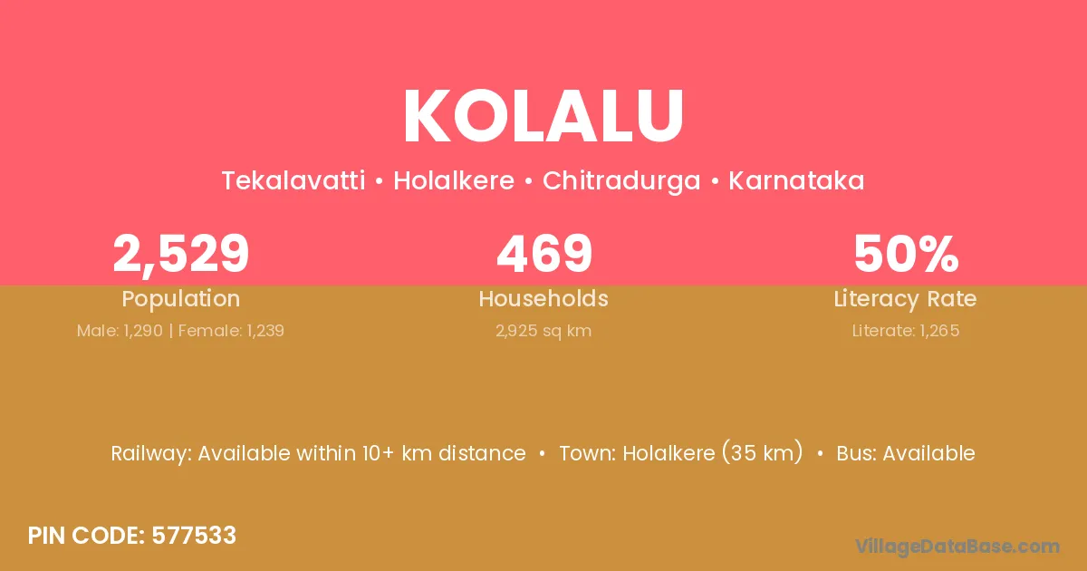 Kolalu village has a total population of 2,529 people, of which 1,290 are males and 1,239 are females.