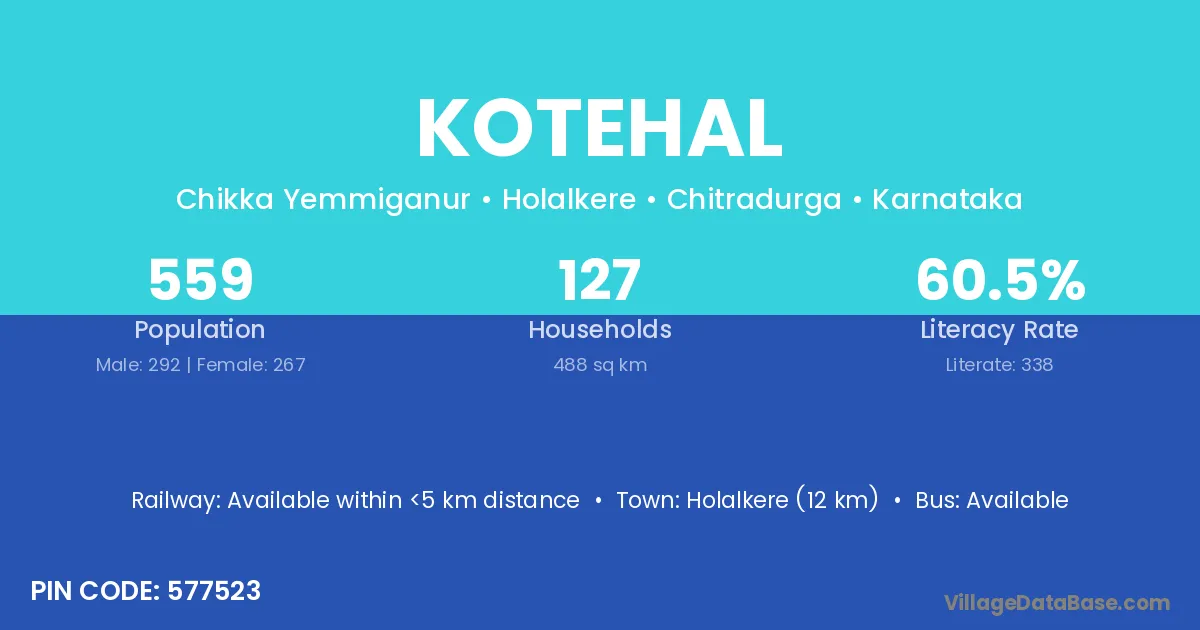 Holalkere (12 km) is the nearest town to Kotehal village for major economic activities and is located approximately 12 km away.