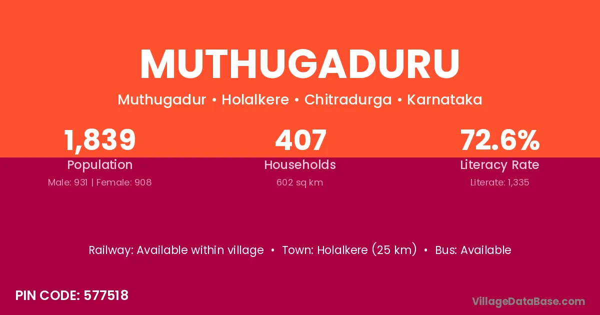 Holalkere (25 km) is the nearest town to Muthugaduru village for major economic activities and is located approximately 25 km away.