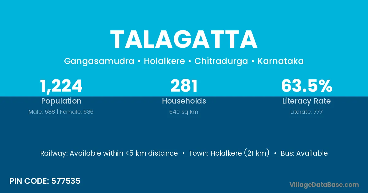Holalkere (21 km) is the nearest town to Talagatta village for major economic activities and is located approximately 21 km away.
