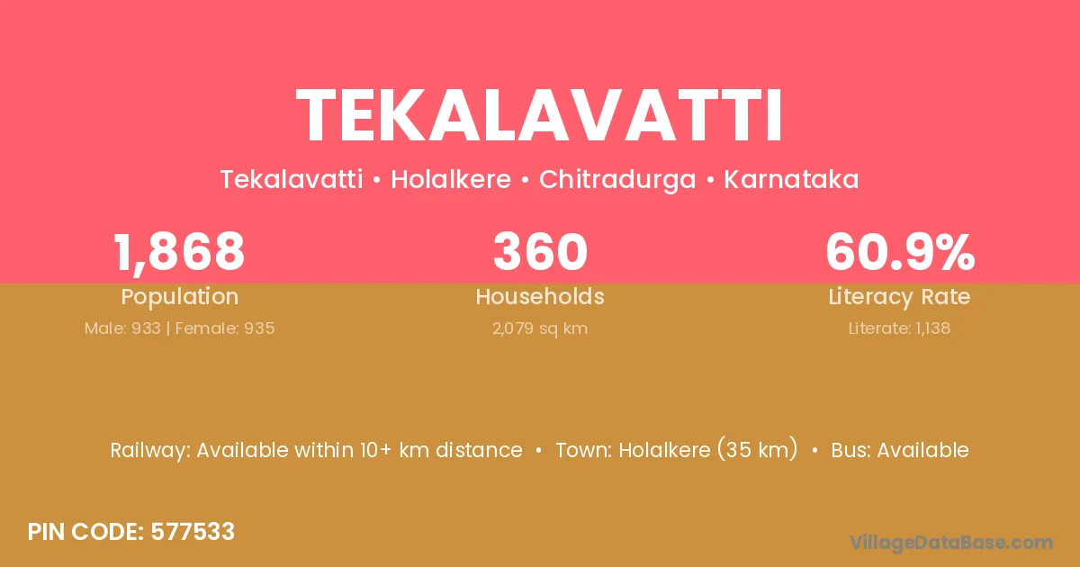 Holalkere (35 km) is the nearest town to Tekalavatti village for major economic activities and is located approximately 35 km away.