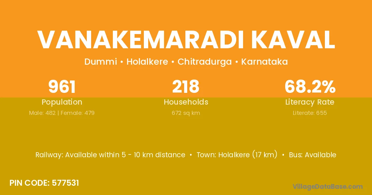Holalkere (17 km) is the nearest town to Vanakemaradi Kaval village for major economic activities and is located approximately 17 km away.