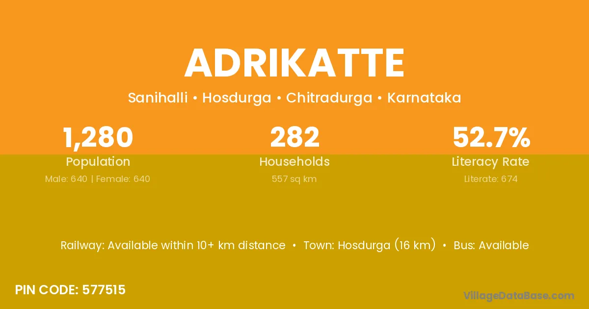 Hosdurga (16 km) is the nearest town to Adrikatte village for major economic activities and is located approximately 16 km away.