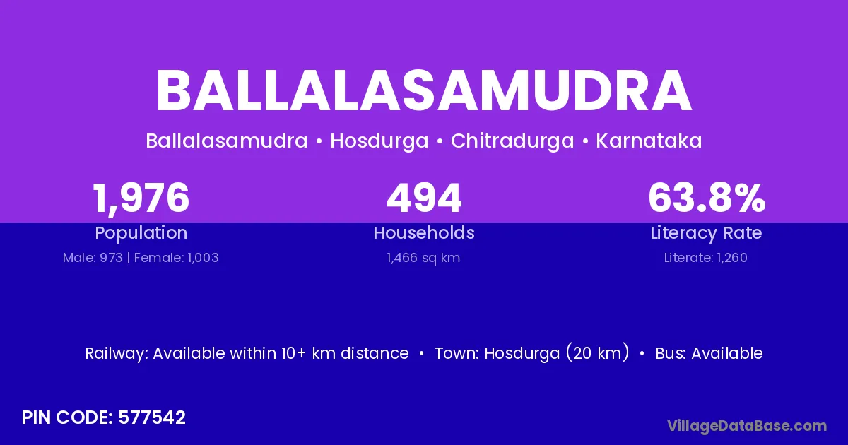 Ballalasamudra village has a total population of 1,976 people, of which 973 are males and 1,003 are females.