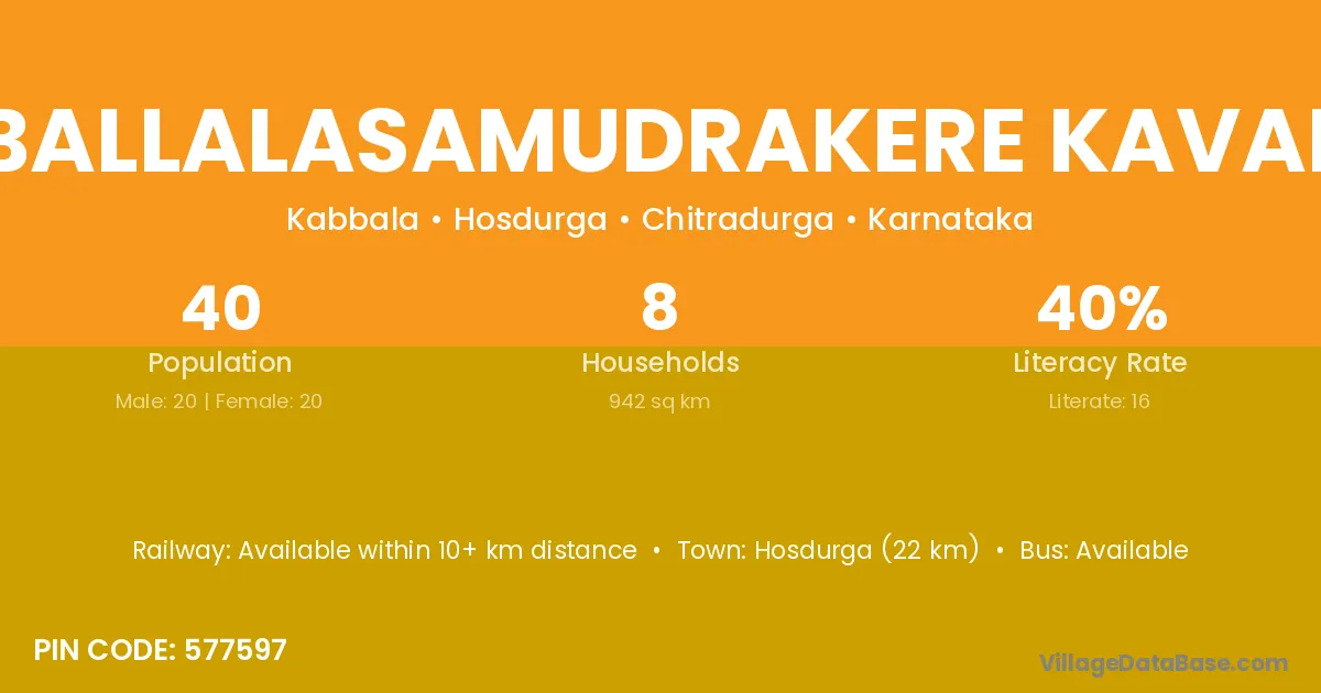Ballalasamudrakere Kaval village has a total population of 40 people, of which 20 are males and 20 are females.