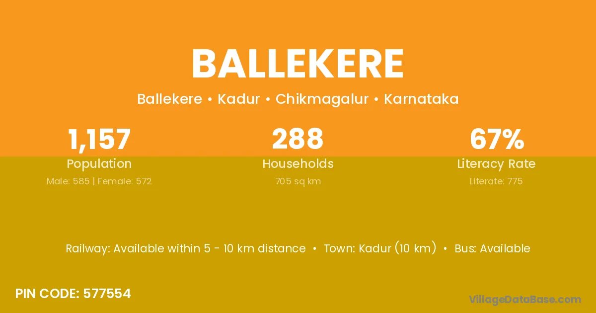 According to Census 2011 information, the village code of Ballekere village is 577554.