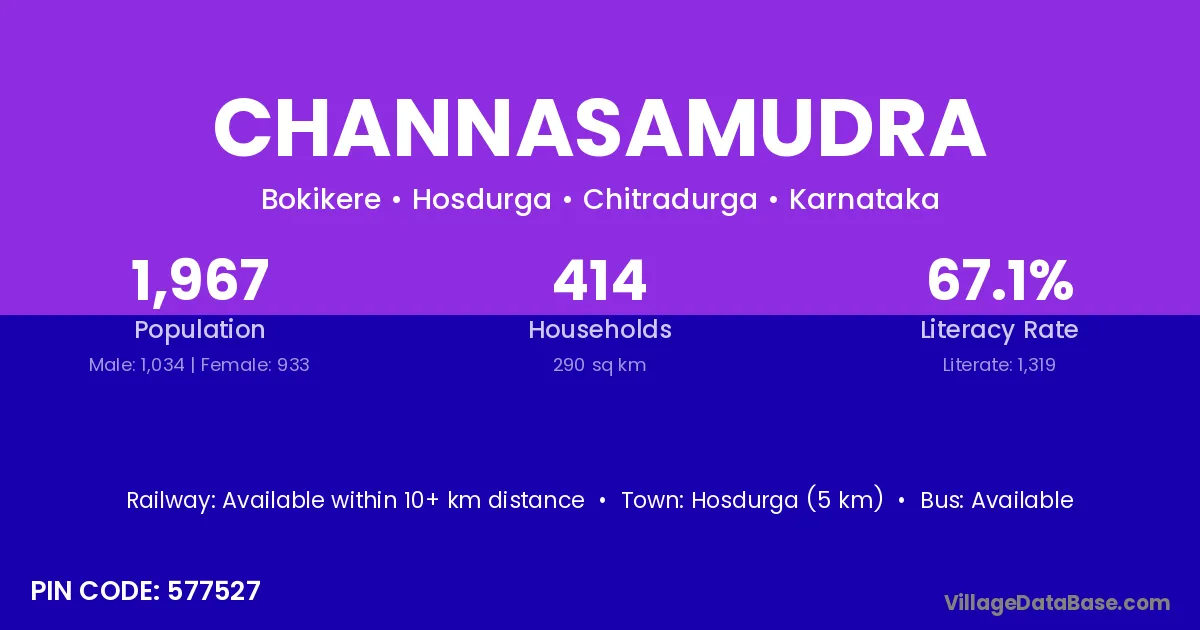 Channasamudra village has a total population of 1,967 people, of which 1,034 are males and 933 are females.