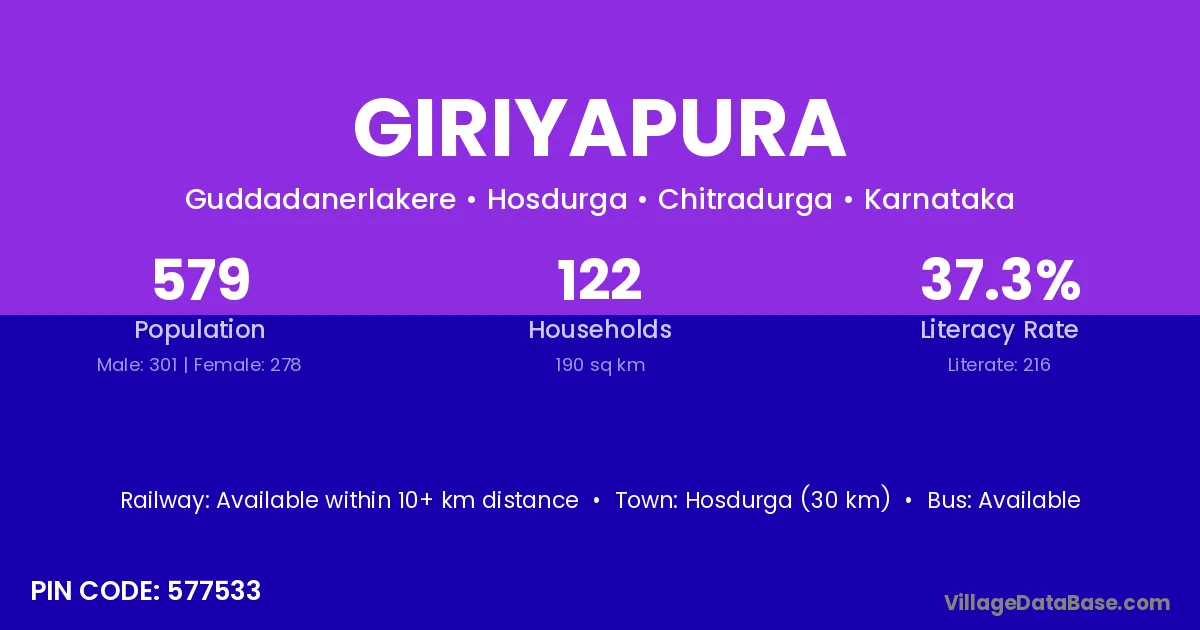 Hosdurga (30 km) is the nearest town to Giriyapura village for major economic activities and is located approximately 30 km away.