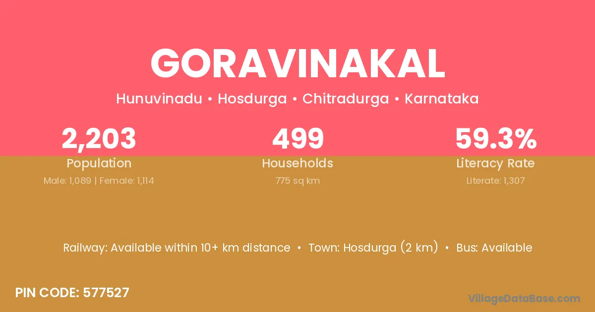 Goravinakal village has a total population of 2,203 people, of which 1,089 are males and 1,114 are females.