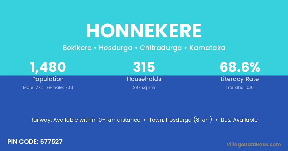 Honnekere village has a total population of 1,480 people, of which 772 are males and 708 are females.