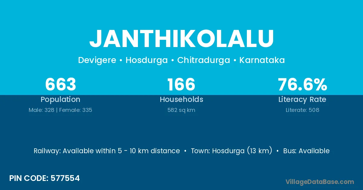 Hosdurga (13 km) is the nearest town to Janthikolalu village for major economic activities and is located approximately 13 km away.