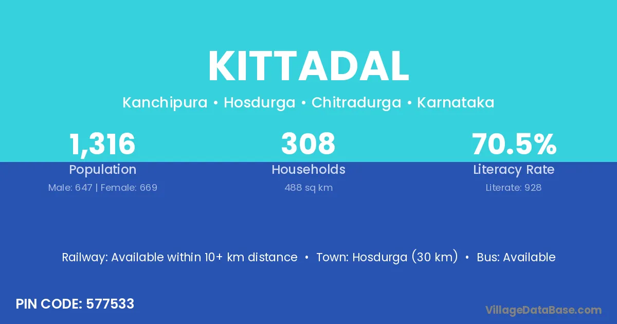 Hosdurga (30 km) is the nearest town to Kittadal village for major economic activities and is located approximately 30 km away.