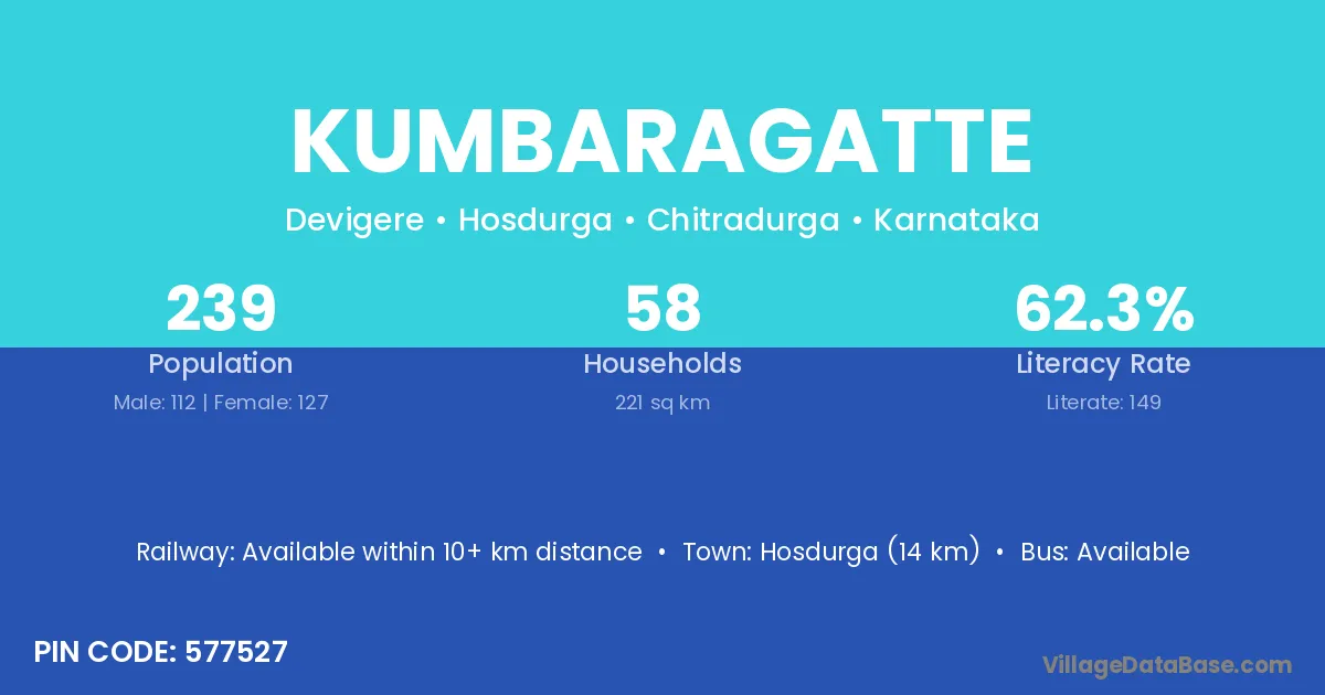 Kumbaragatte village has a total population of 239 people, of which 112 are males and 127 are females.