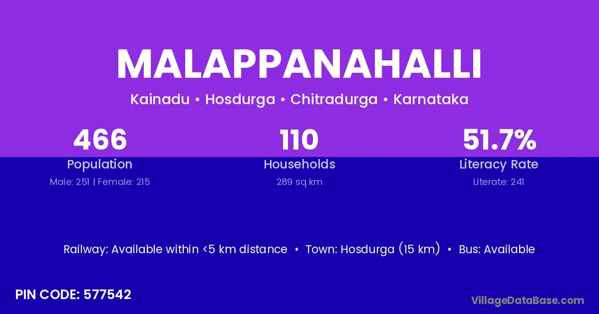 Malappanahalli village has a total population of 466 people, of which 251 are males and 215 are females.