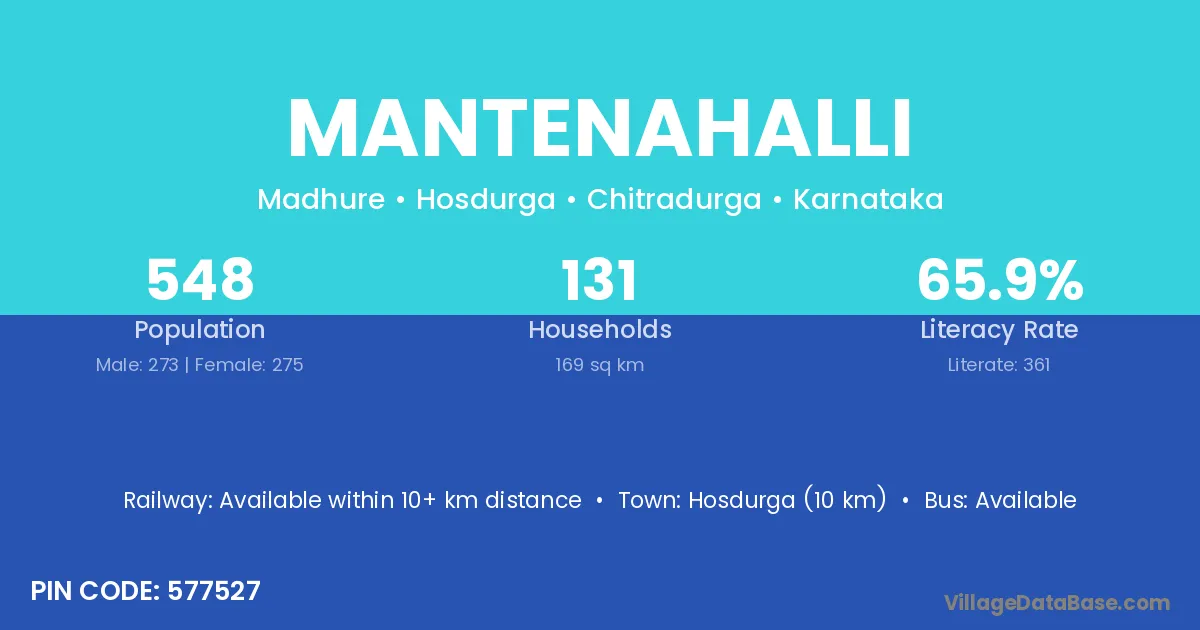 Hosdurga (10 km) is the nearest town to Mantenahalli village for major economic activities and is located approximately 10 km away.