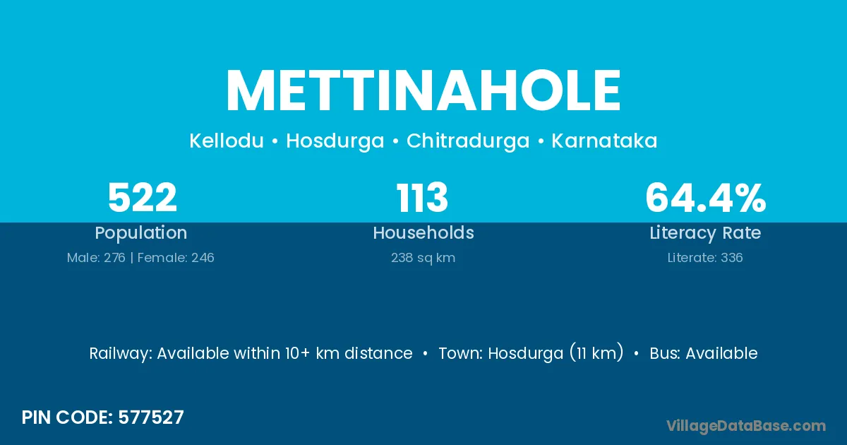 Hosdurga (11 km) is the nearest town to Mettinahole village for major economic activities and is located approximately 11 km away.