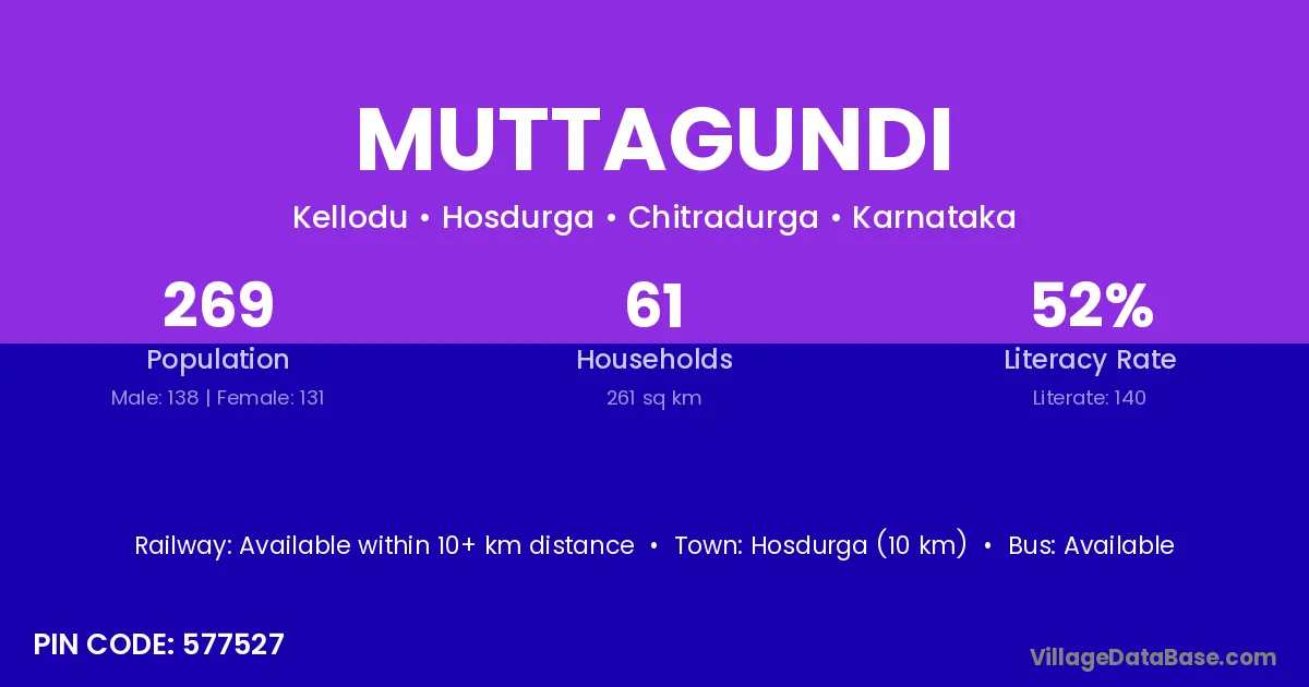 Muttagundi village has a total population of 269 people, of which 138 are males and 131 are females.