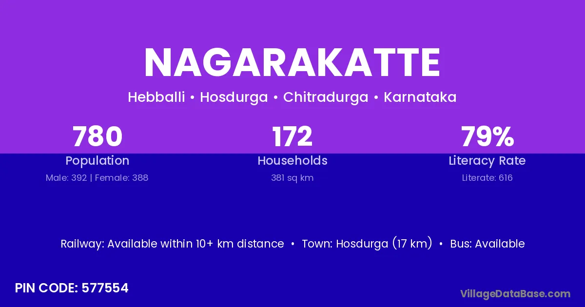 Hosdurga (17 km) is the nearest town to Nagarakatte village for major economic activities and is located approximately 17 km away.